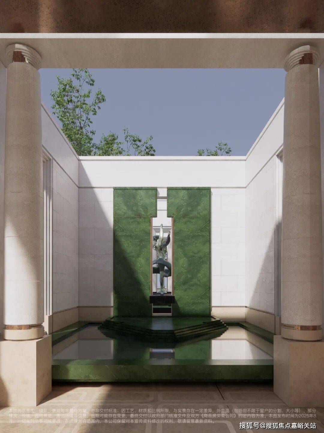 :极具仪式感的归家门头,更复杂的肌理铜板吊顶、宝格绿奢石门套与定制化蚀刻纹样