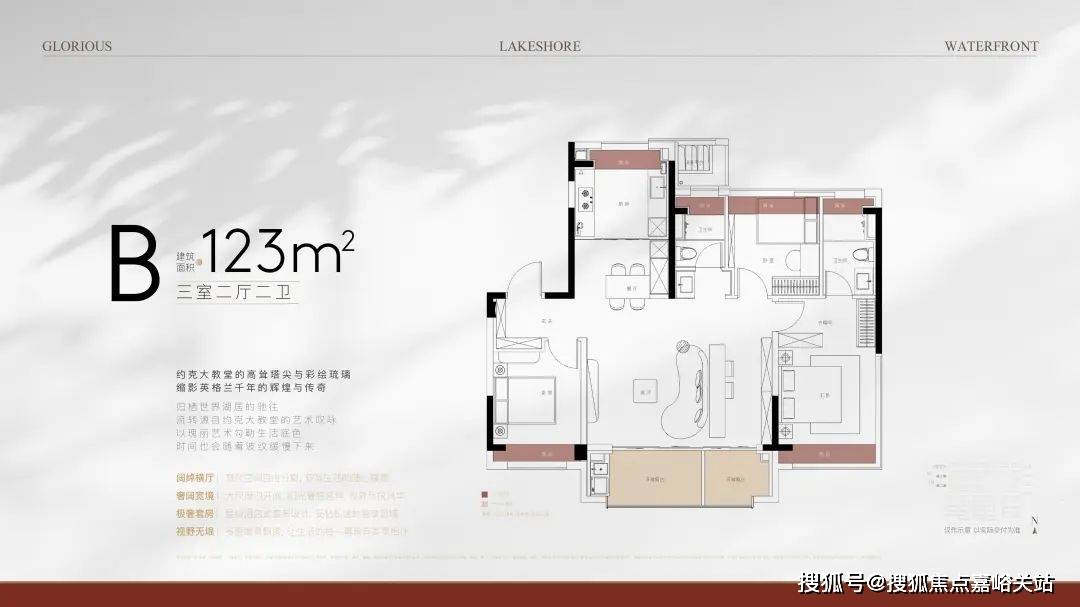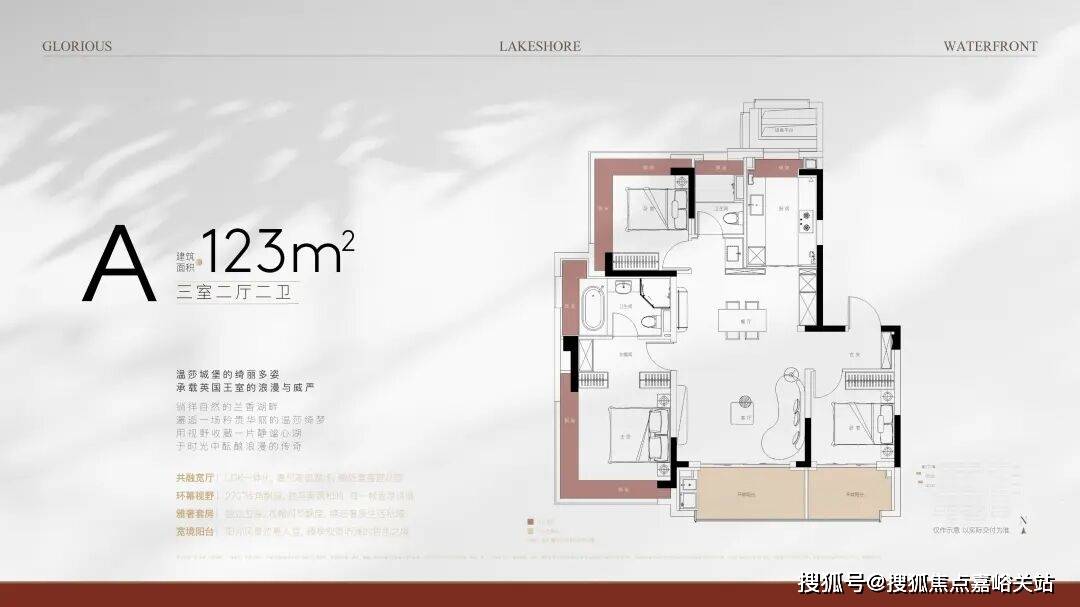 ,经典飞机式户型,独立入户玄关,三开间朝南,客厅面宽约4.5米,南向双阳台;SLDK一体化,餐厅两侧均预留餐边柜位置,全卧及厨房均附赠飘窗,同时,项目拥有超大窗墙比,室内景观视野非常突出。
