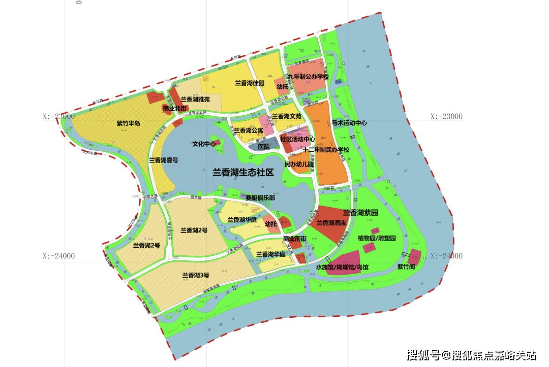 商业街、星月步道、文化艺术长廊、赛艇俱乐部、兰香湖亲子酒店和阳光乐园、青少年活动中心等十多个景观节点。借助丰富的水资源,皮划艇、游艇等水上体育运动项目能丰富当地居住的日常生活,